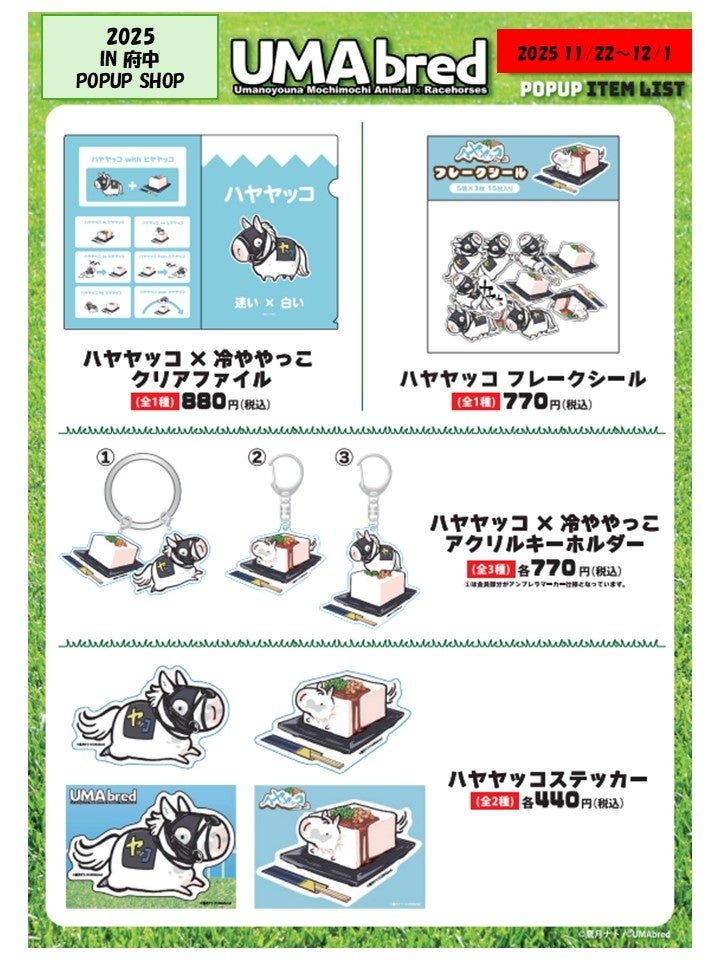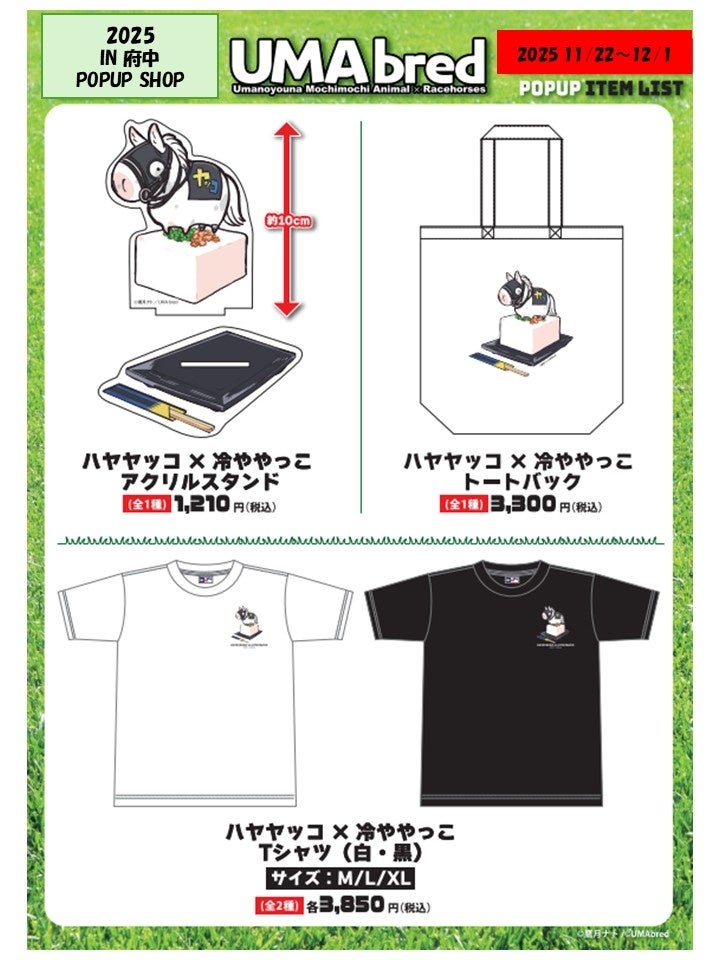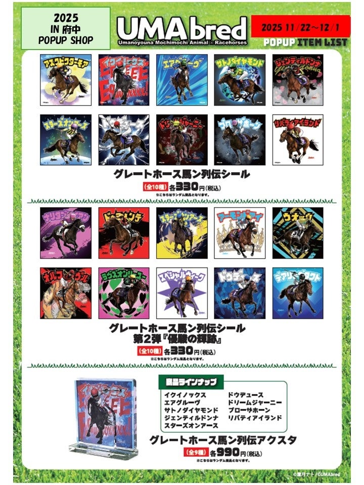 実在の競走馬・引退馬を「UMA」(ウマのようなモチモチアニマル)として描きおろすグッズブランド「UMAbred」は11/22より「UMAbred 大集結 ~府中 秋の陣~」と題し、従来のPOPUPよりも小規模なPOPUPを「サテライトPOPUP」として開催いたします。