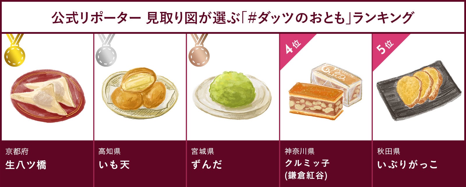 「#ダッツのおとも」公式リポーターの見取り図です。47都道府県の”おとも”全て試食させていただいたのですが、どれも相性抜群でおいしかったです! 今回、甲乙つけがたかったですが、ベスト5を選ばせていただきました。みなさんもお気に入りが見つかると思うので、ぜひ試してみてください。