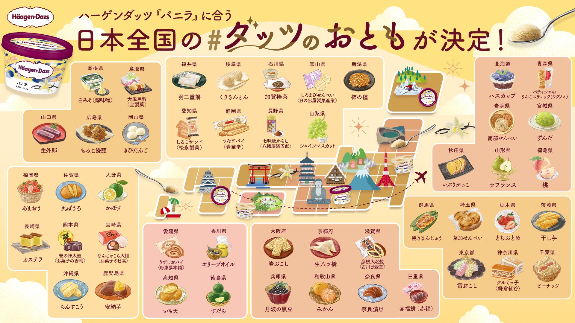 ハーゲンダッツ ジャパン株式会社(本社:東京都目黒区、社長:平井弓子)は、「#ダッツのおとも」プロジェクト※を始動し、ハーゲンダッツ『バニラ』に合う日本全国の名産品(以下、「おとも」)をSNS上で募集してきました。この度、お客様からの応募が多かった“おとも”を中心に選定し、47都道府県それぞれの「#ダッツのおとも」を決定いたしました。