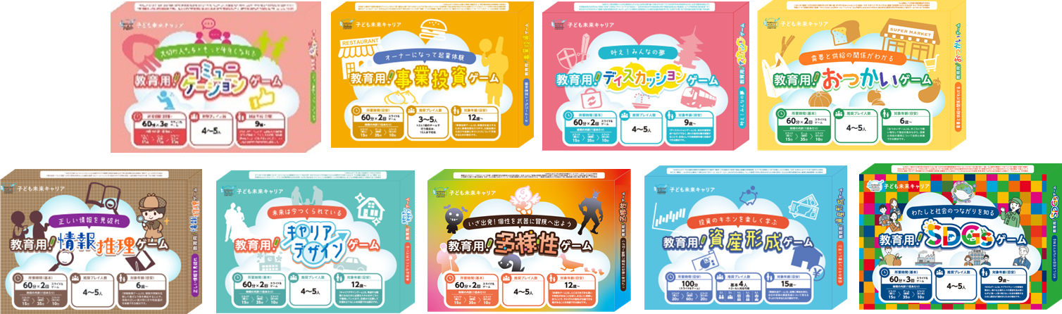 『子ども未来キャリア』は、子どものときから夢や目標を持ち、グローバル社会で必要となる知識と能力を育む、キャリア教育用ボードゲーム教材です。ボードゲームを通じた疑似体験と、スライド教材を活用した学習を組み合わせた「遊び×学び」を融合した内容で、主体的に楽しく学ぶことができます。