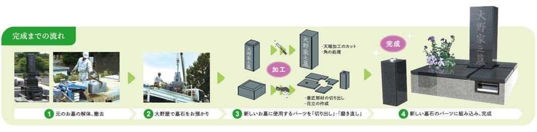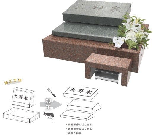 こうした「改葬」自体の需要の高まりと、先祖代々の絆の象徴である元の石碑も一緒に移設したいという多くの要望を受け、この度「リメイクデザイン墓石」を12月より開始します。元の石碑の一部を切り出して加工し、新しい石材との組み合わせで新たなデザインに生まれ変わらせ、先祖や家族の大切な想い出と共に「改葬」することができるようになりました。