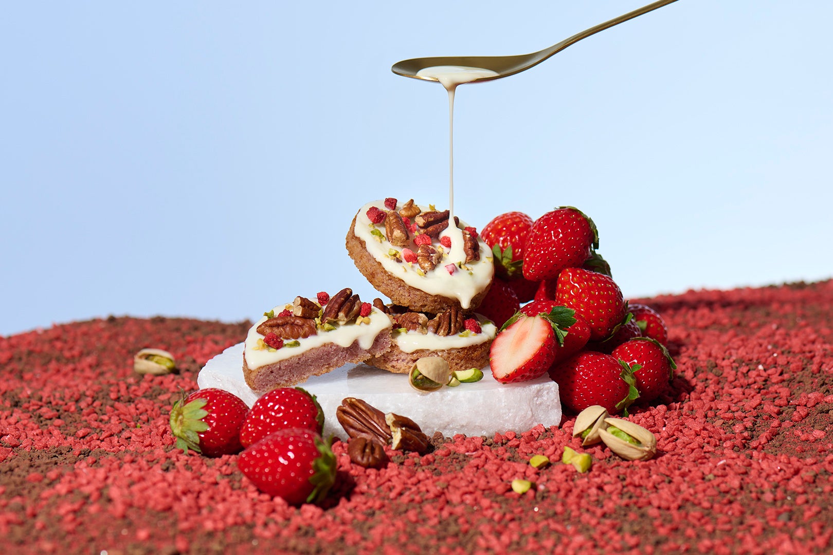 アーモンドとラズベリーのパウダーをそれぞれ混ぜ込んだ、ほのかに甘酸っぱくしっとりとしたブラウニー生地に、濃厚でやさしい甘さのホワイトチョコレートをたっぷり。さらに、ごろっとしたピーカンナッツ、ピスタチオ、ストロベリーをトッピングしました。ザクッとしっとり、異なる食感をお楽しみいただけます。