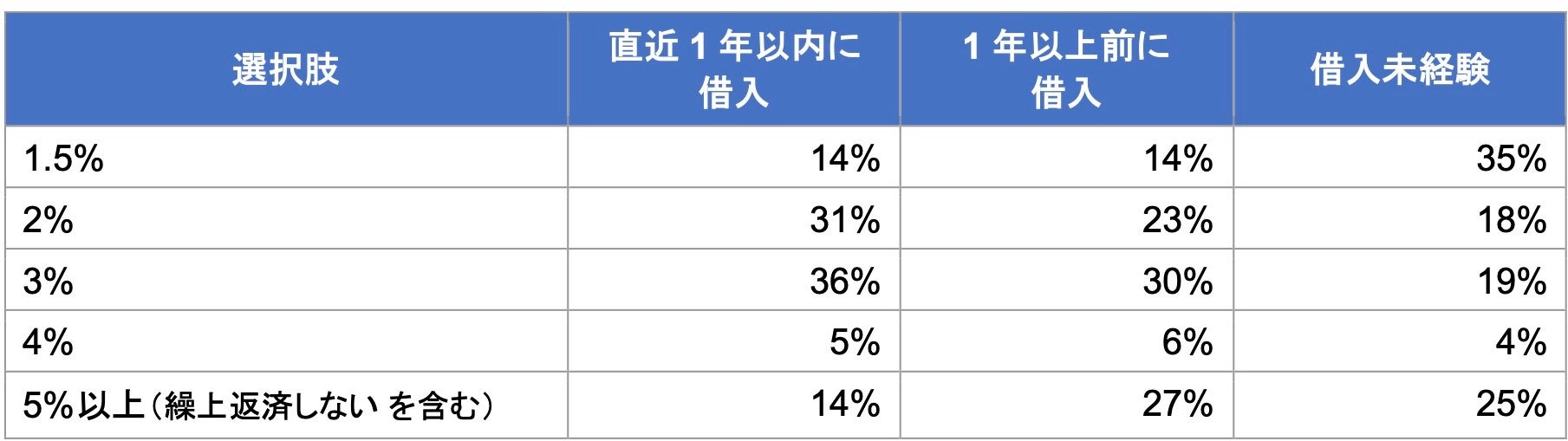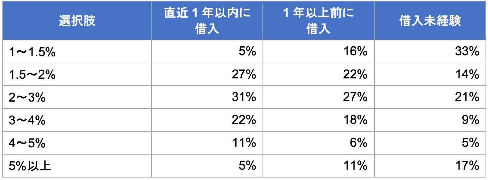一方、住宅ローンを借りたことがない人では「1〜1.5%」が33%と最多である一方、「5%以上」も17%あり、金利の相場観にばらつきが大きい状態です。