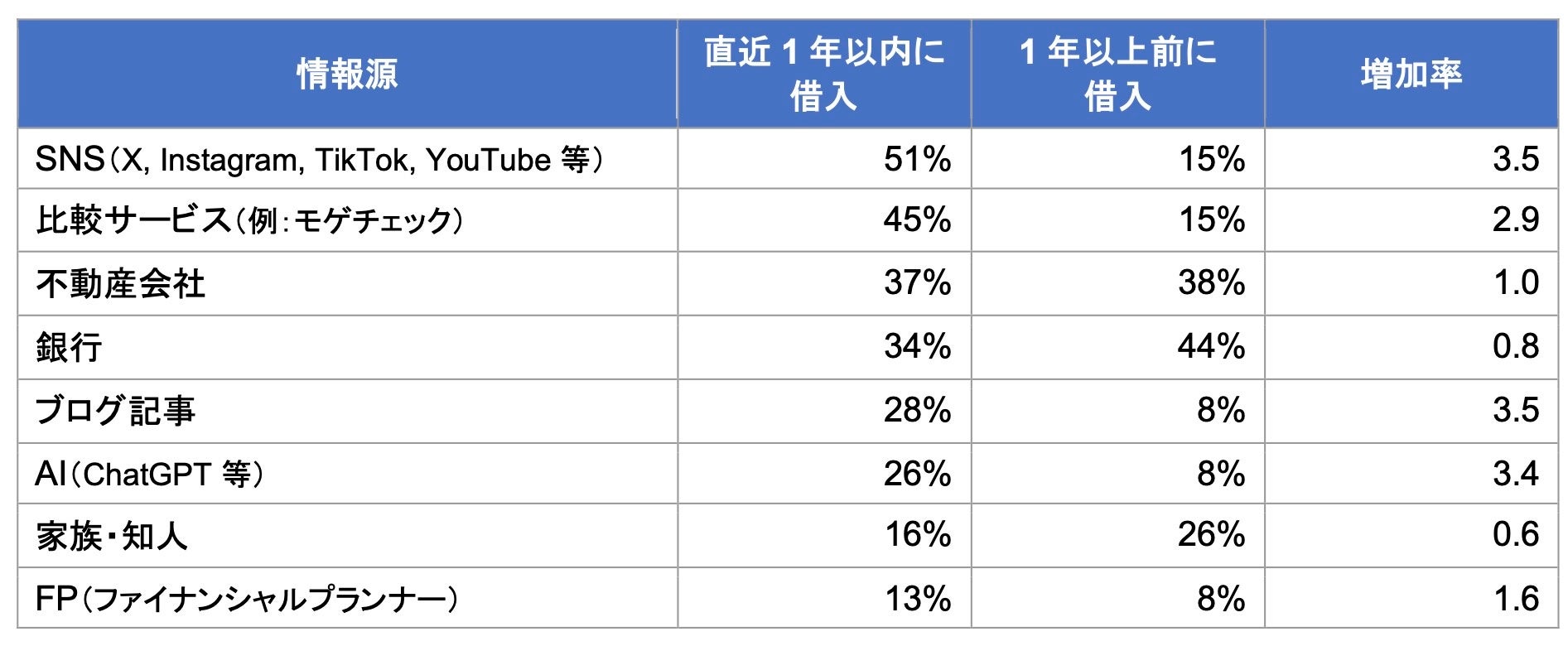 一方、銀行は34%(1年以上前に借りた人では44%)、家族・知人は16%(同26%)と減少しました。特に家族・知人は前回の35%から16%と急減しました。金利のある時代になり、周囲に相談できる経験者が減っていると考えられます。