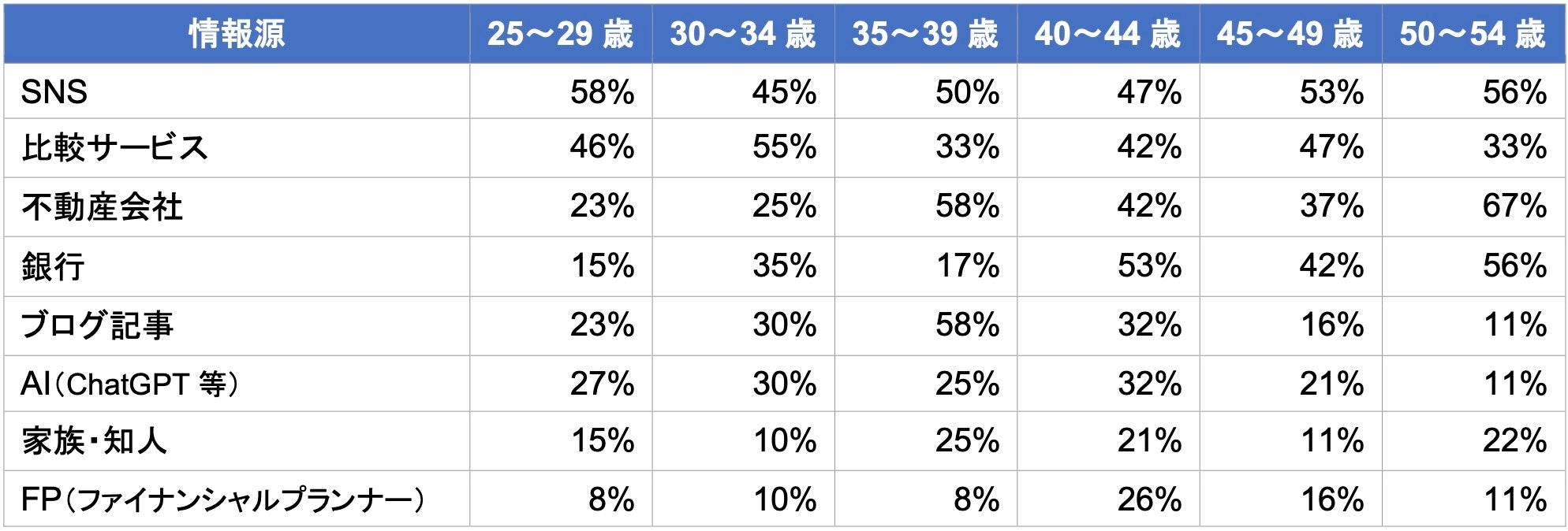 銀行を情報源とする割合は25〜29歳で15%、50〜54歳で56%と世代差が大きく、若い世代は銀行よりオンラインで情報を集めています。AI(ChatGPT等)は40〜44歳の32%が最高で、住宅購入の中心世代にもAI利用が広がっています。