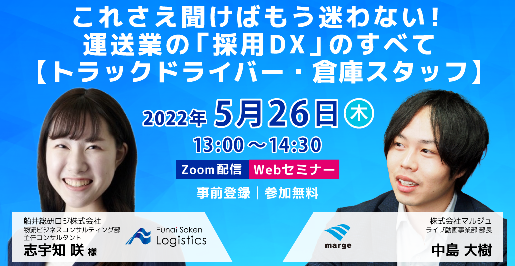株式会社マルジュは、5/26(木)14:00から"運送・物流会社の採用DX"をテーマにした無料Webセミナーを開催致します。