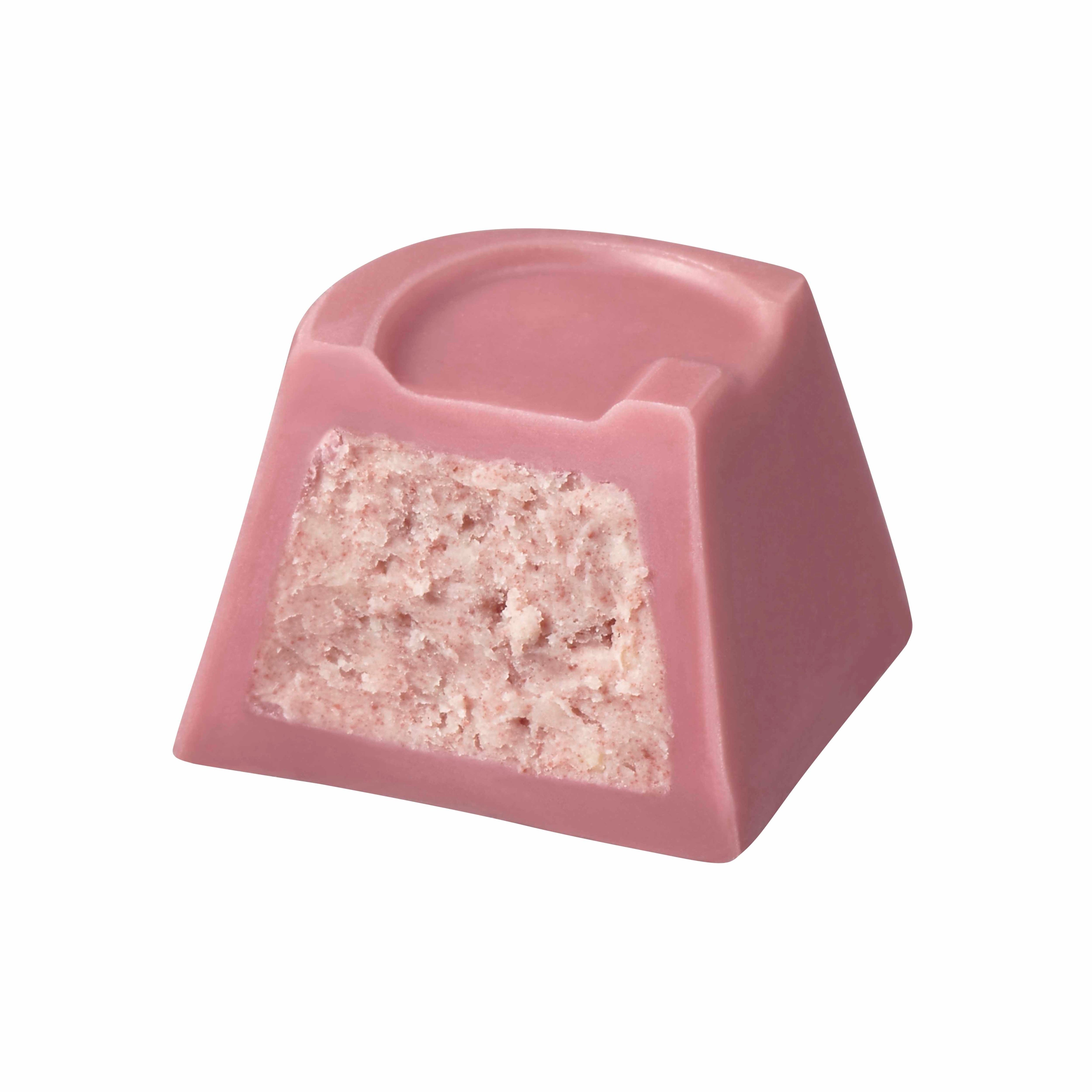 サクサクとしたクランブルの入った、ホワイトチョコレートのストロベリームースをルビーチョコレートで包みました。