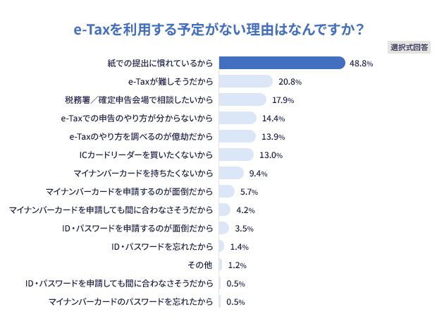 一方、e-Taxを利用しない理由については、1位「紙での提出が慣れている(48.8%)」に続き、「e-Taxが難しそうだから(20.8%)」「e-Taxでの申告のやり方がわからないから(14.4%)」が挙げられています。「ICカードリーダーを買いたくない(13.0%)」という、制度への誤解がハードルとなっている例も見受けられました。