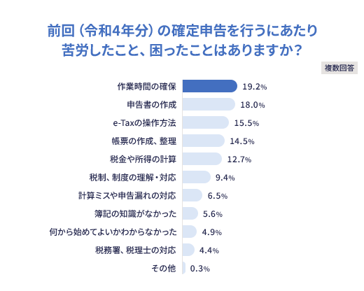 確定申告の具体的な課題として、「作業時間の確保(19.2%)」が最も多く、以降は「申告書の作成(18.0%)」、「e-Taxの操作方法(15.5%)」、「帳票の作成、整理(14.5%)」が続きました。