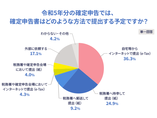 令和5年分の確定申告の提出方法予定について、「e-Taxによる提出」との回答が36.3%と最大になりました。一方「紙による提出」も根強い需要があり、「税務署に持参して提出」が24.9%、「税務署に郵送して提出」が9.2%と続いています。