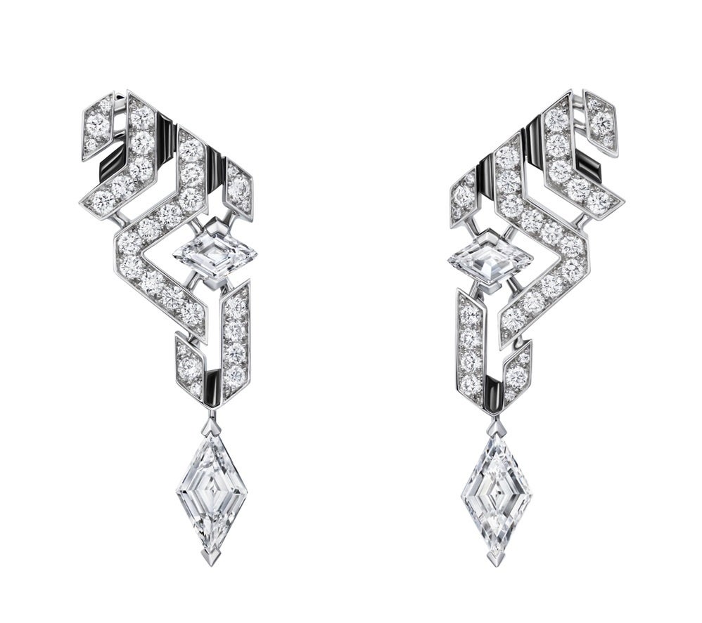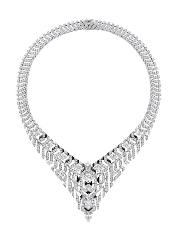 ホワイトゴールド、オニキス、ダイヤモンドで制作されたネックレスには、稀少で見つかりにくく、見つけてもすぐに居なくなってしまうユキヒョウのエッセンスが捉えられています。凛としたデザインは、トロンプルイユ(だまし絵)の効果を用いたライン使いにより、見る角度に応じてユキヒョウの頭が見え隠れします。メインストーンは、3.51カラットのロゼンジシェイプ ダイヤモンド1石と、2.55カラットのカイトシェイプ ダイヤモンド1石。カイトカット、ロゼンジカット、トライアングルカットのダイヤモンドが織り成す幾何学モチーフをベースに、オニキスをアクセントに添えた組み合わせは、カルティエを代表するカラーコンビネーションの一つです。1336時間もの作業を経て完成したこのクリエイションは、密と疎空が交互に現れることで、神秘的な動きの感覚を生み出します。