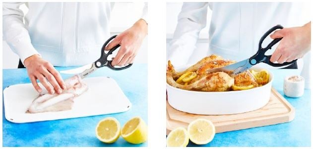 「アイスフォース カーブシザーズ」は、カーブしたギザ刃が滑りやすい食材を逃さずしっかり掴み、特に肉や魚のカットに大活躍するキッチンばさみです。ティファール独自の「アイスフォーステクノロジー」を採用した刃は、鋼を高温で熱処理した後、マイナス120℃に急冷することで、鋼の硬度が増し、鋭い切れ味が持続します。本体には高品質で耐久性に優れたドイツ製の鋼を使用しており、錆びにくいという特長もあります。