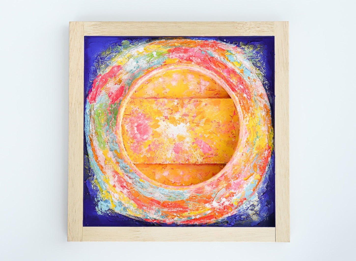 提灯の木枠と竹ひごを、大胆に中央に配置したアート作品。祭の中心で輝く提灯を太陽に見立てています。横から見ると立体感があり、エネルギーに溢れた仕上がりです。