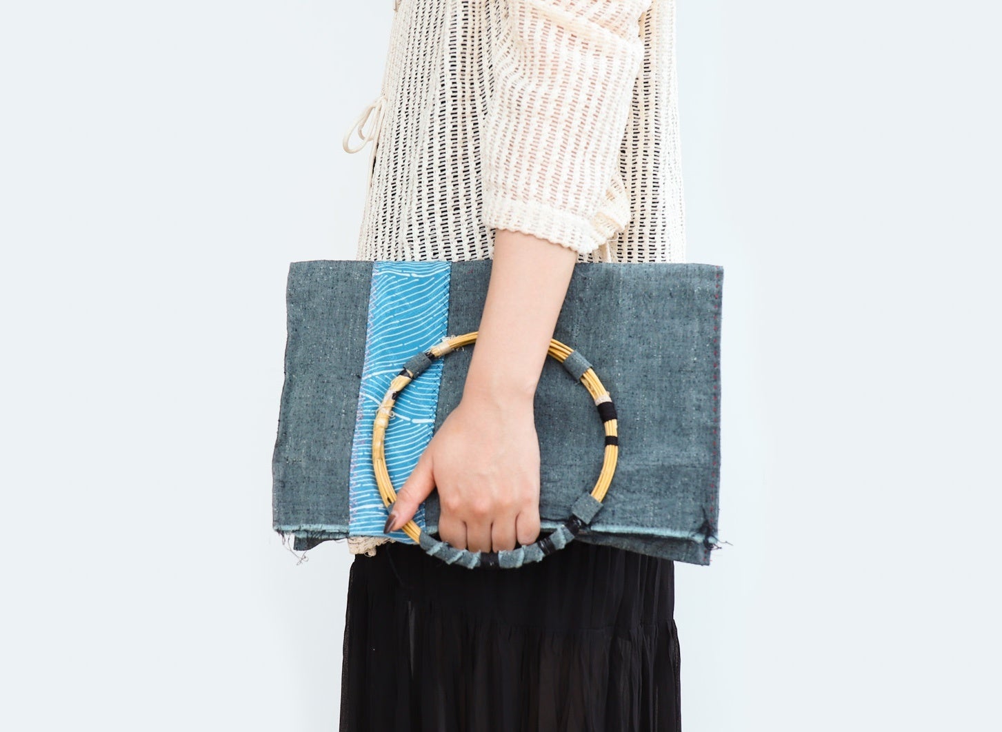 竹ひごを重ねて作ったサークルが象徴的なクラッチバッグ。生地は着物をリメイクしたもの。サークル部分を取手にしてトートバッグとして使用することもできます。