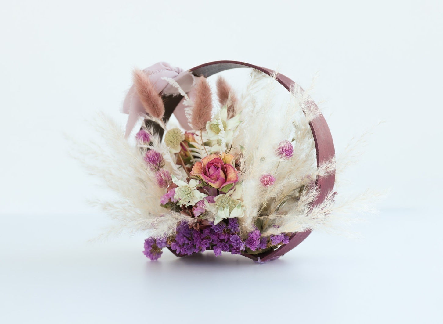 アーチ部分に提灯の木枠を活用したアレンジメント。ふわふわとしたパンパスグラスという植物が、稲穂に見立てた竿燈を連想させます。