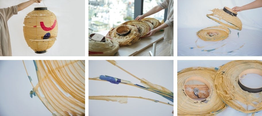 秋田竿燈まつりで使用される提灯は、薄い和紙や細い竹ひごが使われています。提灯の骨組みは、竹ひごを組み合わせ、糸をかけて作られます。その上に和紙を貼り、さらに堅牢度を高めるための油が塗られています。廃棄される提灯は、祭で使われた後に練習で使い込まれたもので、竹ひごが折れているものや、紙が破れて絵柄がほぼ見えないもの、紐が切れているものとなります。今回はこの提灯の形状や、竹ひごや上下の木材、和紙などの一部分を用いて、自由な発想でアップサイクルするオリジナルアイデアをクリエイターから募集しました。