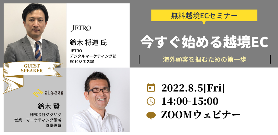 WorldShopping BIZを提供する株式会社ジグザグ(本社:東京都渋谷区、代表取締役:仲里一義)は、2022年も成長が期待される越境ECをテーマに、「今すぐ始める越境EC」と題して、越境ECの全体像説明から自社ECサイトを活用した越境ECの手法まで、最新動向に関するウェビナーを開催致します。
