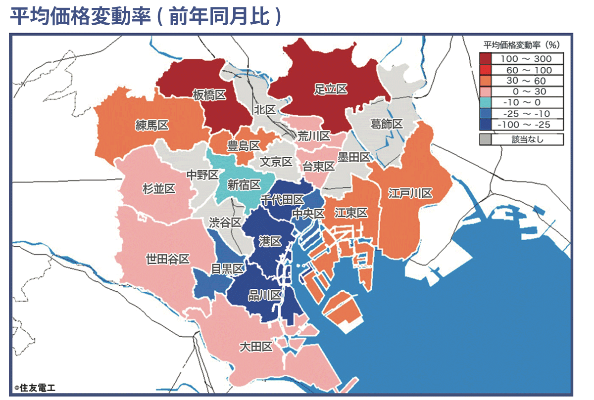 地図の各行政区ごとの色の違いは、同行政区における平均価格の前年同月比(平均価格変動率)の程度を表しています。