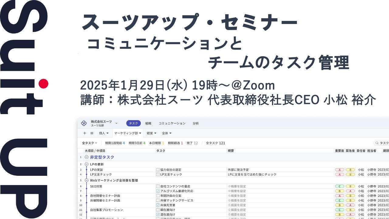 株式会社スーツ(所在地:東京都千代田区、代表取締役社長CEO:小松 裕介)は、2025年1月29日(水)19時から、当社代表の小松が講師を務めるスーツアップ・セミナー「コミュニケーションとチームのタスク管理」を無料開催します。
