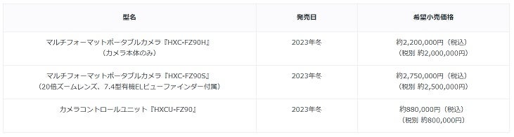 本製品は、カメラ本体のみの『HXC-FZ90H』に加えて、20倍ズームレンズ及び7.4型有機ELビューファインダーを付属したパッケージモデル『HXC-FZ90S』の2モデルを販売します。
