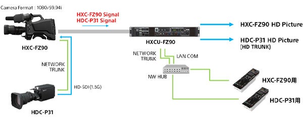 HD Trunk機能により、『HXC-FZ90』で撮影中のHD映像信号に加えて、本機のSDI端子に入力したHD映像信号を、一本の光ファイバーケーブルでカメラコントロールユニットに同時に伝送できることに加え、Network Trunk機能によって、カメラ機器のネットワーク制御信号もやり取りすることが可能です。『HXC-FZ90』と、カムコーダーなどの光伝送機能を有しないカメラとを組み合わせて撮影する際に、カメラ映像やネットワーク制御信号の伝送用ケーブル敷設作業を軽減するなど、運用状況に応じたシステム構築が可能となります。