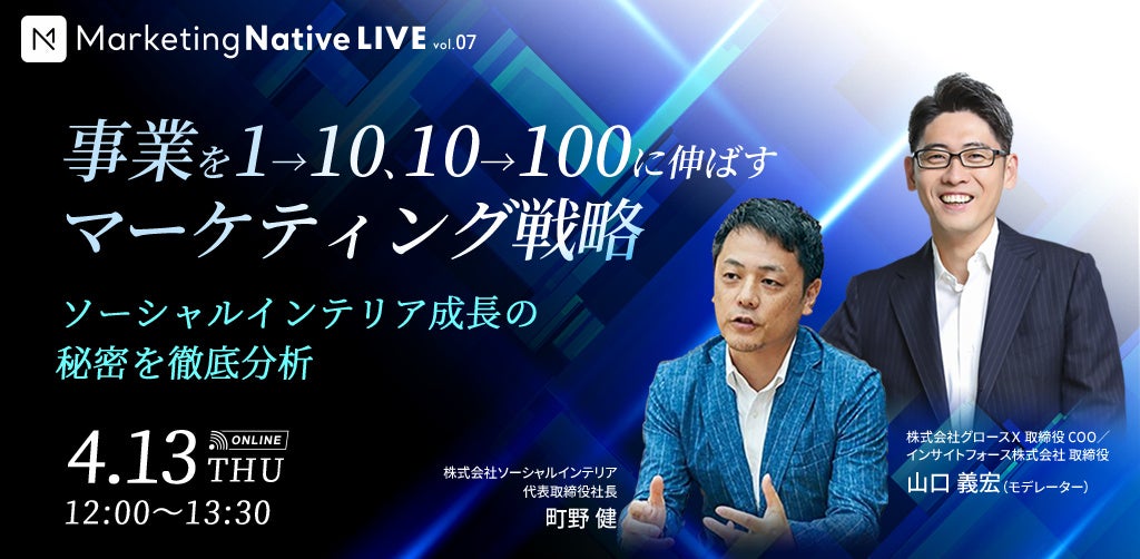 【4/13開催】「事業を1→10、10→100に伸ばすマーケティング戦略 ソーシャルインテリア成長の秘密を徹底分析」町野健(ソーシャルインテリア)×山口義宏(グロースX/インサイトフォース)