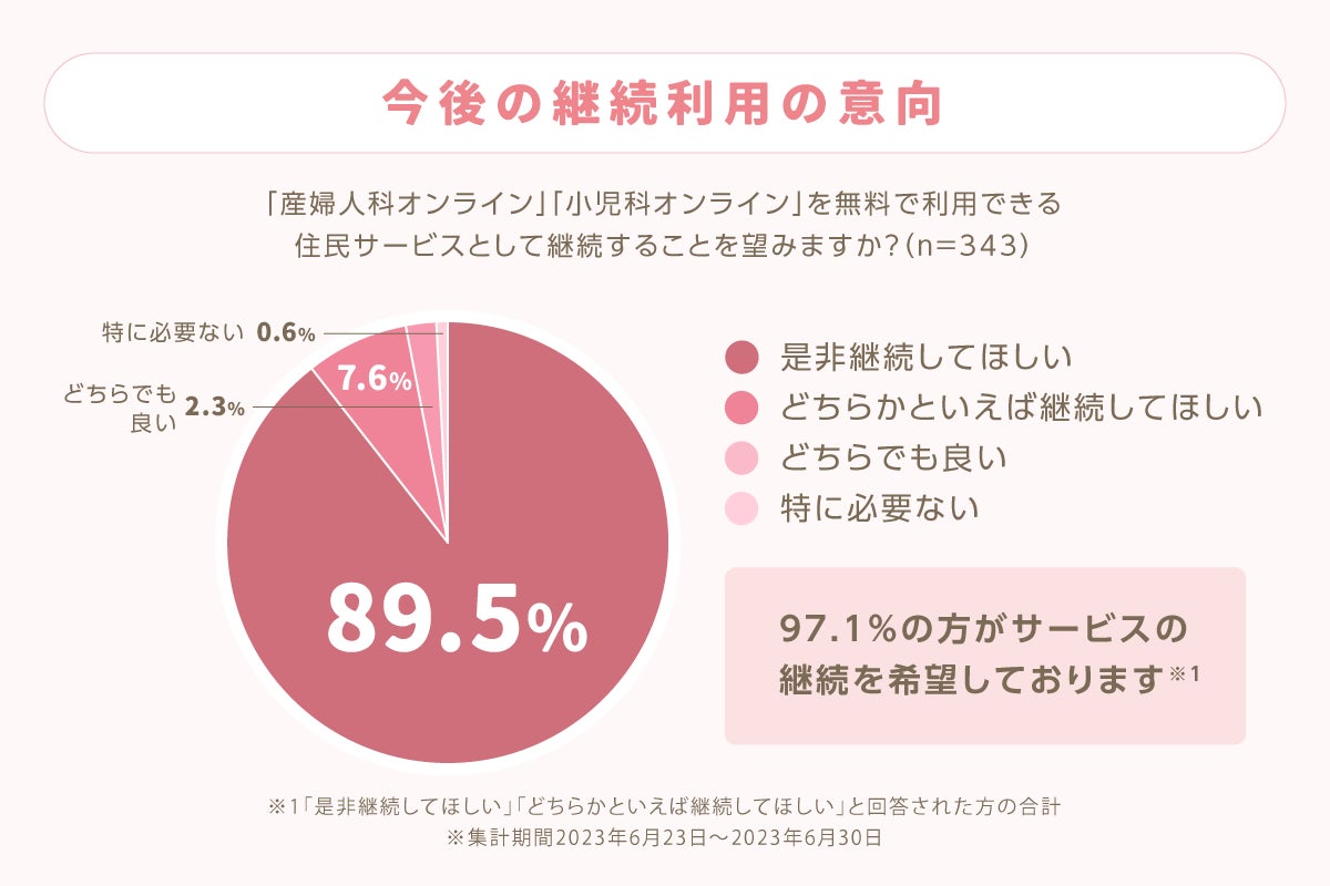 利用者の97.1%の方が、引き続き富山県において『産婦人科・小児科オンライン』のサービス継続を希望していらっしゃいます。(「ぜひ継続してほしい」「どちらかといえば継続してほしい」と回答された方の合計)