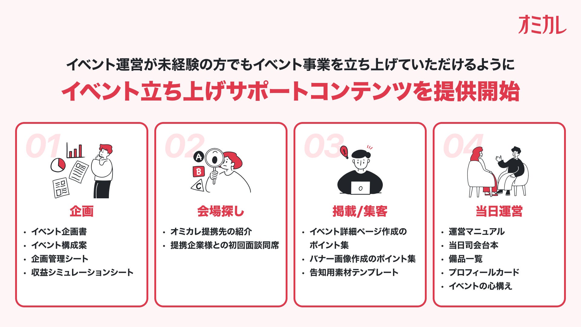 そこでオミカレは、会員数95万人超・掲載数日本No.1※の実績から得た知見を活かし、「①未経験事業者の参入障壁を下げること」「②早期に運営を軌道に乗せ、安定開催を実現すること」を目的に、本パッケージを開発しました。
