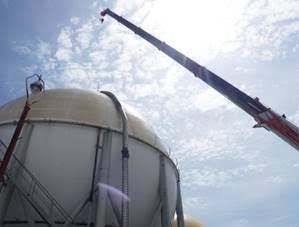 球体タンクの目視検査は法律で義務づけられており、定期検査を実施しています。⼈⼒による従来の検査方式では、タンクの中を空にし、検査員が調査するための足場を組む必要がありました。定期検査は時間コストおよび⾦銭コストの負担が⼤きく、また、検査員が足場を伝いながら作業するため、落下事故などの危険も伴う状況でした。