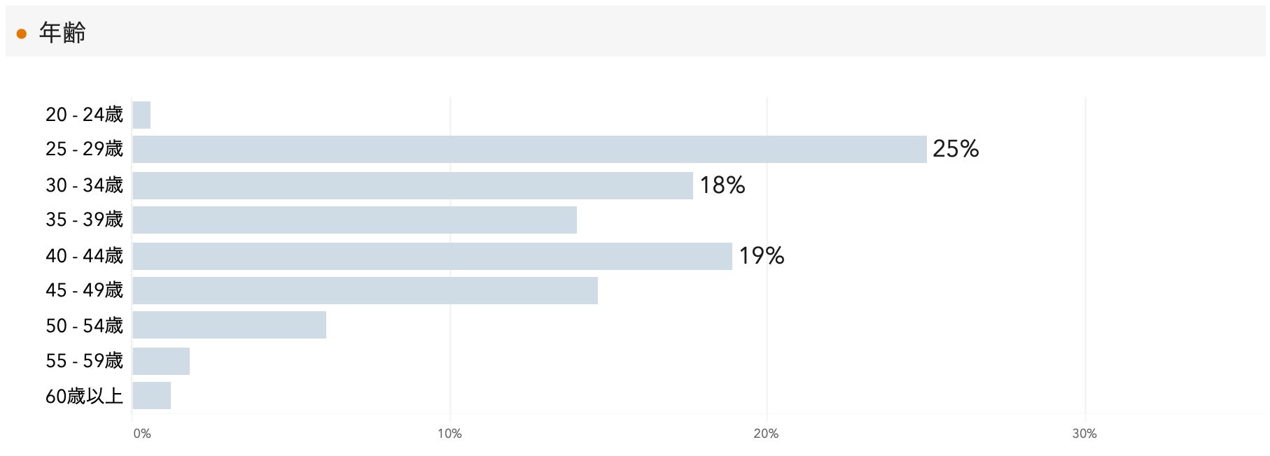 最も割合の高い年齢帯は25〜29歳で25%(前月比同率)となり、続いて40〜44歳の19%、30〜34歳の18%となります。