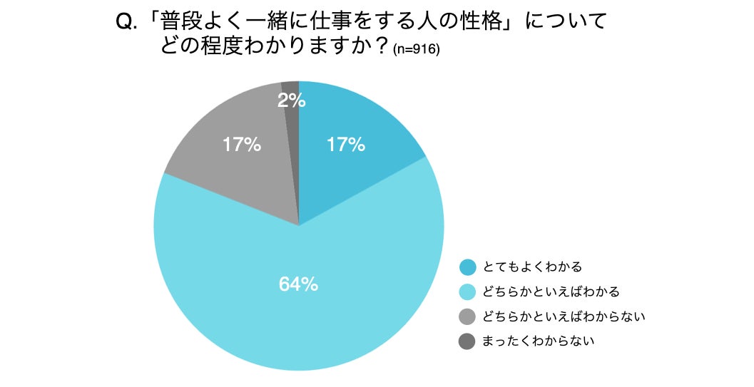 しかし、「一緒に働く人の性格」を、とてもよくわかると解答したのはわずか17%にとどまったほか、「自分の性格」をよく理解できているのは25%という結果となりました。