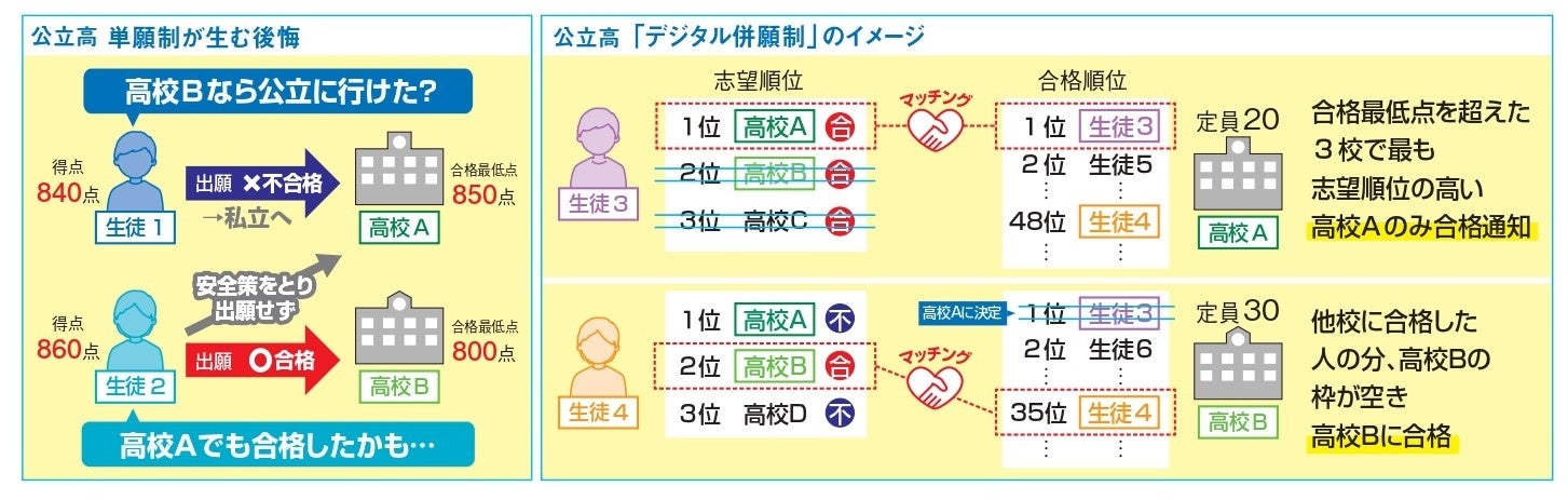 デジタル行財政改革会議で4月、高校入試の「デジタル併願制」について提言が出されました。現在、ほとんどの都道府県の公立高校入試は1校にしか出願できない「単願制」です。これに対し、「デジタル併願制」は、受験生が複数の公立高校に「志望順位」をつけて出願でき、各高校が出す「合格順位」とアルゴリズムでマッチングさせることで、スムーズに複数校の合否や進学先を決めることができる仕組みになります。受験生の後悔や都道府県の負担を減らすメリットがある一方、受験制度が大きく変わることによる混乱も予想されます。