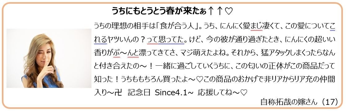 そんな中、新しい生活様式で職場や学校でもマスクを付け、対人距離をとることが日常となってきています。そういう時だからこそ、ひとクチュで、これまで避けがちだった「にんにくの風味」を堪能しつつ、ふたクチュで、希薄になりがちなコミュニケーションに対し香りというメスを入れる洗口液『モンダミンめっちゃにんにく』を開発いたしました。すれ違った際、ふわっと漂う残り香であなたの印象を残したくはありませんか?きっとあなたもクセになるはず・・・