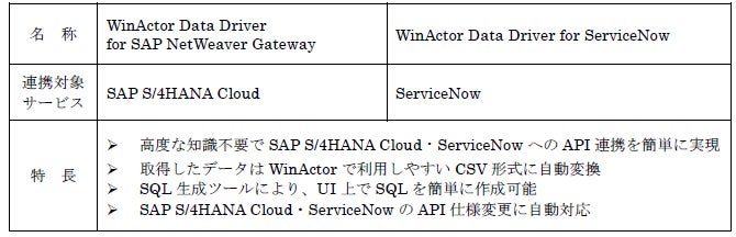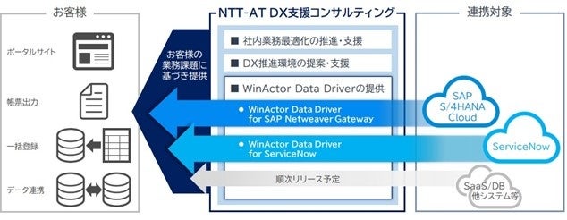NTTアドバンステクノロジ株式会社(以下:NTT-AT、本社:東京都新宿区、代表取締役社長:伊東 匡)は、DX(デジタルトランスフォーメーション)支援コンサルティング強化の一環として、お客様の社内業務最適化推進・支援の体制強化を図るとともに、WinActorシナリオセンタのラインアップとして、SAP S/4HANA® Cloud・ServiceNow®とのシステム・データ連携を簡単に実現する「WinActor® Data Driver」の提供を開始しました。