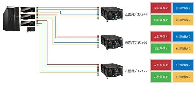 ワークステーション1台で3台のプロジェクターへ映像出力する際の構成。この例ではアプリケーション側で2人分の両目用の映像を生成し、プロジェクター側で4チャンネル分の時分割映像として合成した上で出力している。