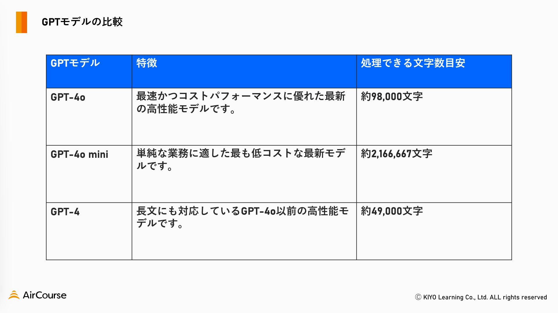 KIYOラーニング株式会社(東京都千代田区、代表取締役社長:綾部貴淑、以下KIYOラーニング)は、法人向け生成AIサービス「AirCourse AIナレッジ」が、OpenAI社の最新AIモデル「GPT-4o」と「GPT-4o mini」の提供を本日より開始しました。従来のモデルよりもコストパフォーマンスに優れた高速・高性能な最新モデルが追加されたことで、より一層の業務効率化を可能にいたします。