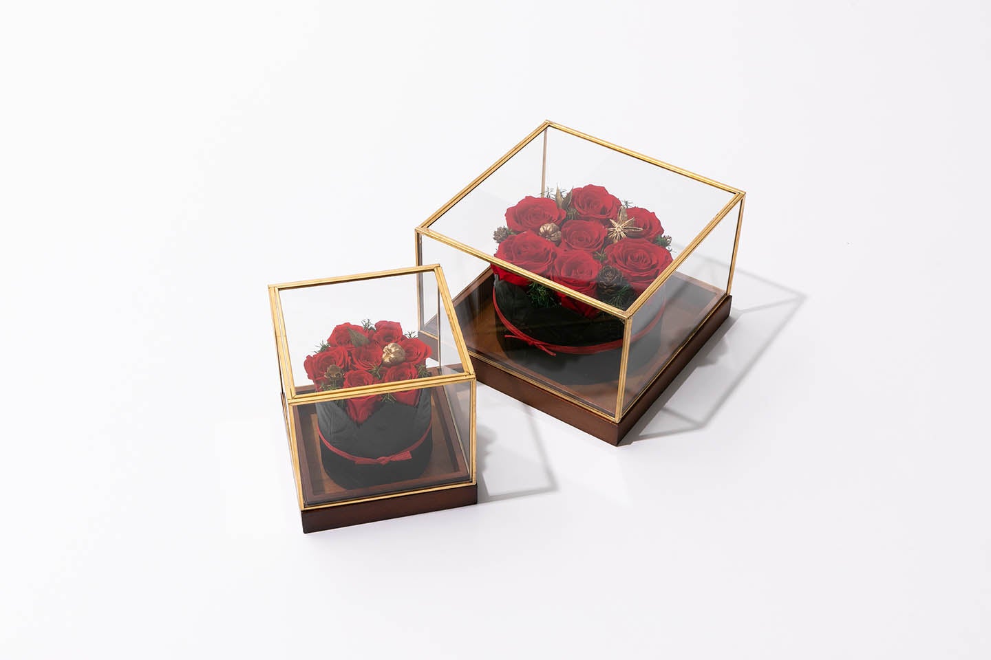 クリスマスをイメージした真っ赤なバラに、ゴールドのアクセントが心躍る、ギフトにぴったりのプリザーブドフラワーです。