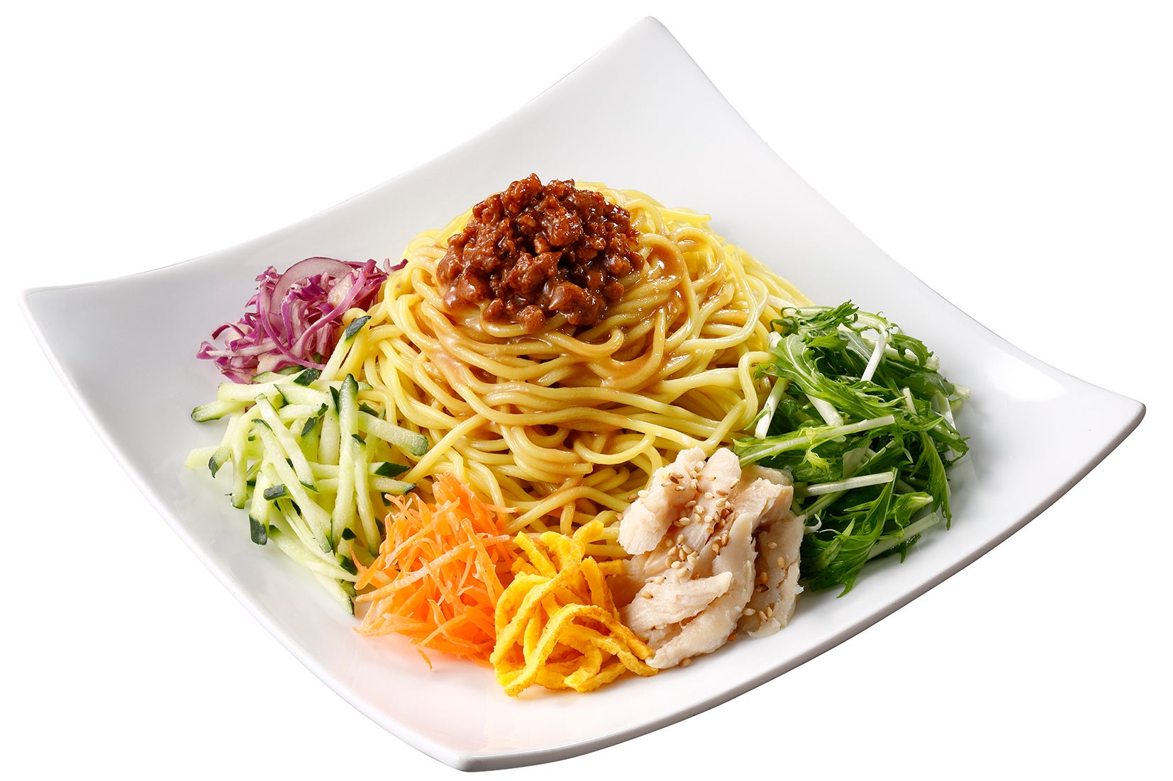 ピリ辛の鶏そぼろや蒸し鶏、錦糸玉子、紫キャベツ、水菜など彩りよく具材をトッピング。少し酸味をきかせたごまだれが食欲をそそる仕立てとなっています。