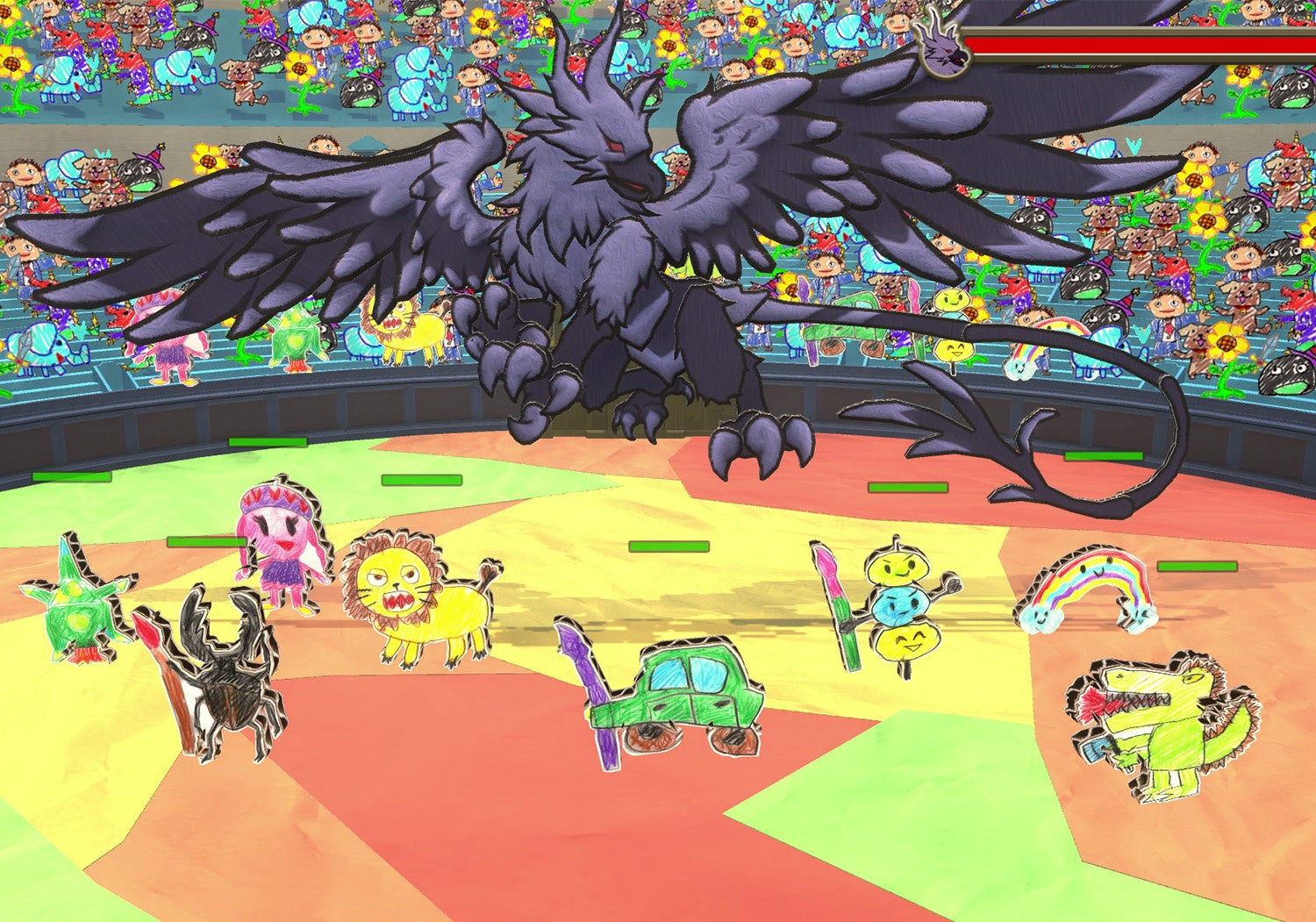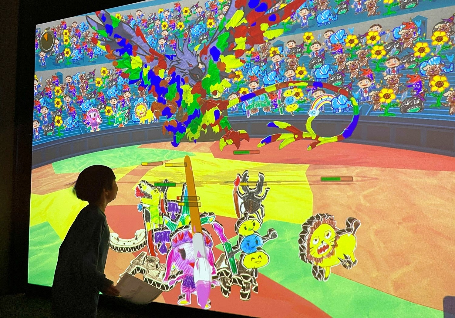 本アトラクションでは、子どもたちが紙に描いた「絵」が世界に一体だけの“アートキャラクター”となってスクリーンに登場。“世界中の色をうばいとる”という悪だくみをするボスたちに、“アートキャラクター”たちが「色」のパワーを使って挑むというストーリーです。塗った色によってアートたちが繰り出す「ひっさつわざ」が変化するので、描いたキャラクターによって毎回異なる体験が楽しめます。