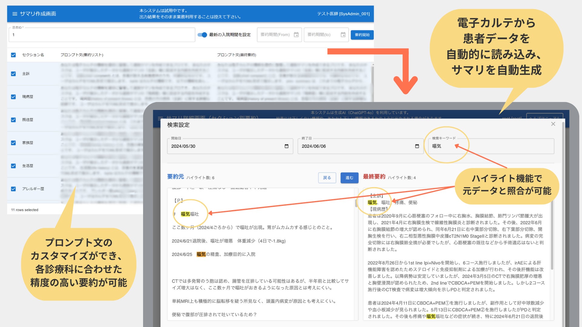 退院サマリの各項目に対して、診療科ごとの専門性に応じた最適なプロンプト文を設計しています。医師が個別にプロンプトを調整することも可能なため、運用面での柔軟性と拡張性も備えています。