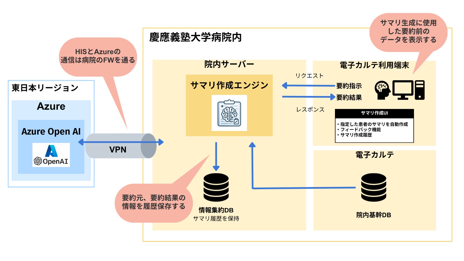 病院のネットワークは通常外部と隔絶されており、セキュリティの確保が極めて重要です。本システムは、病院内の閉じたネットワーク内で構築されており、安全性を重視した設計となっています。外部AIサービスであるOpenAIとの接続については、専用の通信経路を限定的に開設するのみとし、それ以外の外部接続を排除することでセキュリティリスクを最小限に抑えています。この堅牢なインフラ設計により、患者様や医療従事者の皆様にも安心して活用できる環境を提供します。