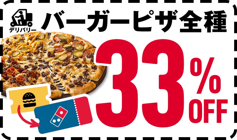 1月16日の「バーガーピザ」発売以来、多くのお客様から「一見ピザだが、食べるとバーガー」「脳をバグらせるピザ」「思った以上にバーガー」との驚きの体験をしていただいています。「バーガーが大好き」。「バーガー屋のクーポン持っている」。そんなあなたに、ぜひドミノ・ピザのバーガーピザを食べてほしい!そこで、バーガー屋さんのクーポンをご提示いただくだけで、バーガーピザがどれでも33%になるキャンペーンをご用意しました。世界のどこのバーガー屋さんのクーポンでもOK。紙でもデジタルでもOK。見せるだけでOK。話題の『バーガーピザ』を是非この機会におトクにご堪能ください。