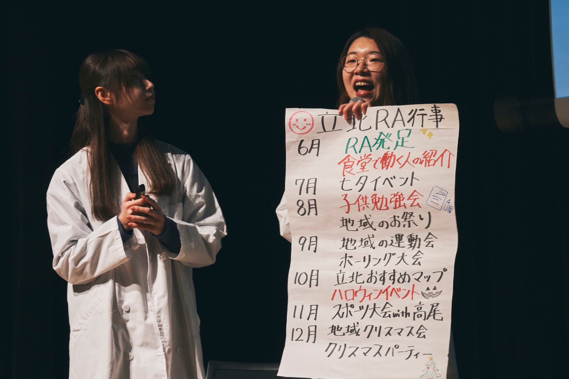 ▼内容:現役RAが寮でのエピソードやRAになったきっかけを赤裸々に語る今回初となる企画。寮長や先輩からの推薦がきっかけでRAを始めたが、イベント企画を通して成長でき、自信がついた、とRAの魅力を語りました。また、クリスマスなどの行事メニューの際には喫食数が上がる、嫌いな食べ物が出ると友達を呼ぶなど、寮での『あるある』エピソードも披露し会場に笑いを起こしました。