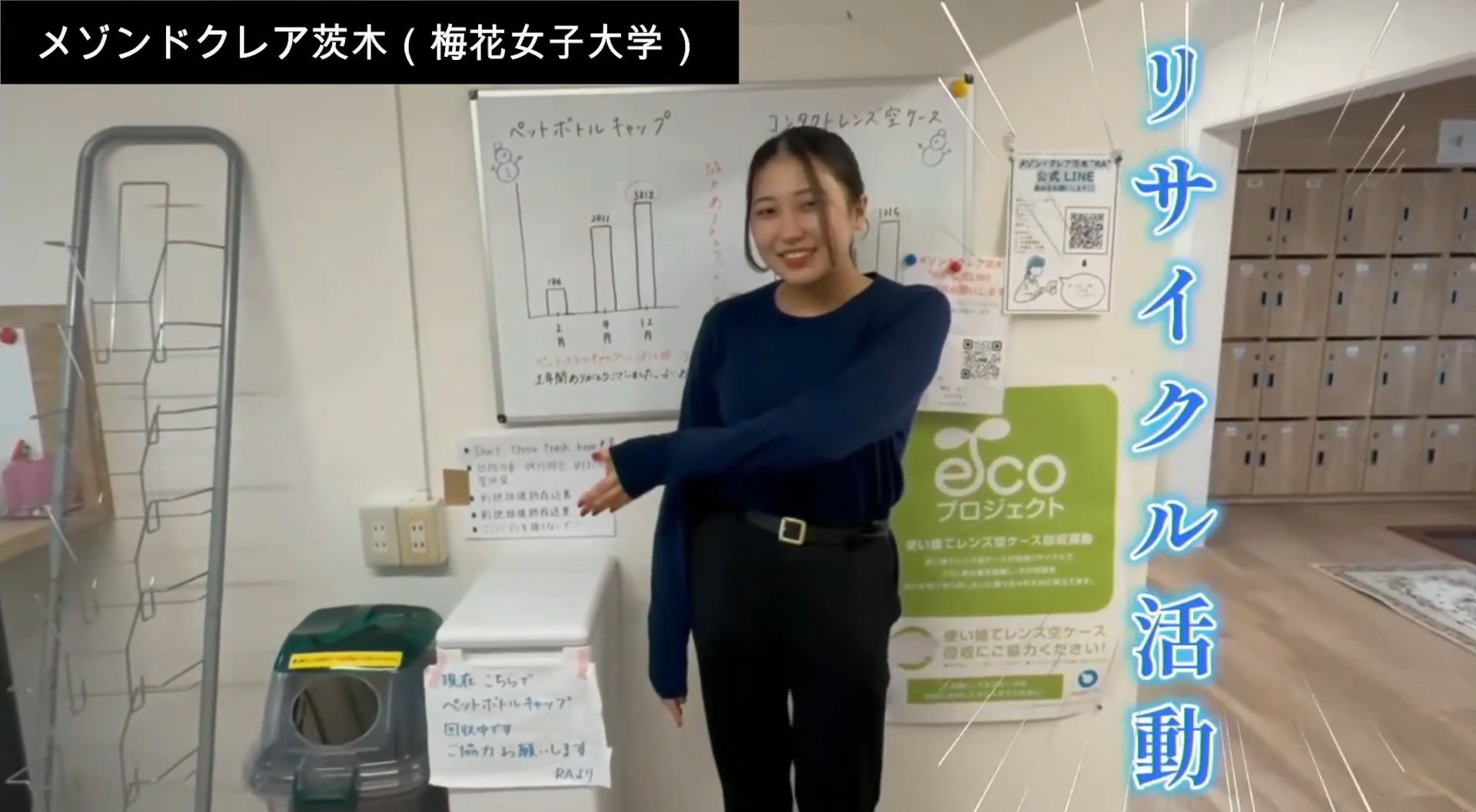 ▼内容:全国のRAたちが1年間の寮生活のハイライトや学びを30秒の映像にまとめました。メゾンドクレア茨木ではリサイクル活動を紹介。ペットボトルキャップだけでなく、コンタクトレンズの空ケースの収集結果を発表しました。