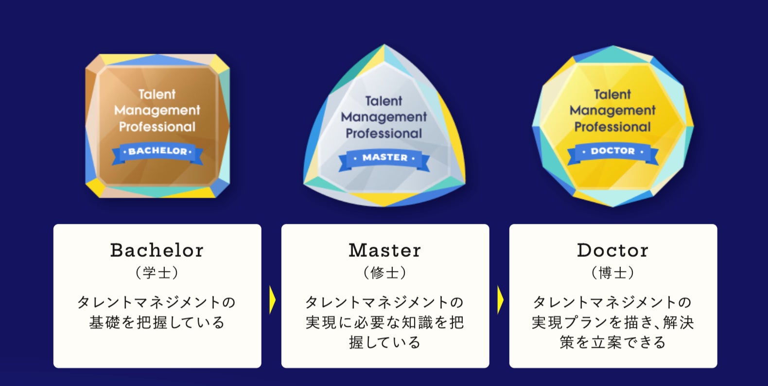 「カオナビ」を管理者として利用されている方を対象に、タレントマネジメントに取り組んだ実績を客観的に証明できる資格制度です。資格は難易度に応じて分かれており、Bachelor(学士)、Master(修士)、Doctor(博士)の順に3つのランクを設定しています。出題される問題は、タレントマネジメントの考え方、人事施策、システムの活用方法の3種類で構成されており、コアとなる考え方のほか、単なる業務効率化にとどまらないシステムの活用法などを学ぶことができます。