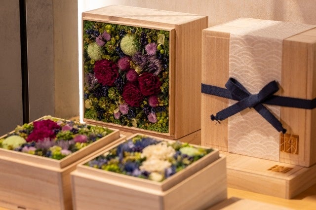 プリザーブドフラワーをオリジナルロゴ入りの桐箱に詰めたアレンジメント。