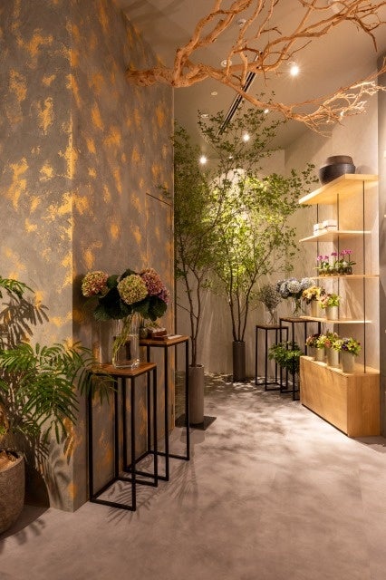 木材を使用したナチュラルな雰囲気の店内の一部壁面には、塗料の特性を活かしてペイントし、同じ物はふたつとない色味や質感でひとつのアート作品のように仕上がる「テクスチャーペイント」と呼ばれるヨーロッパで古くから伝わる技法を採用。この「テクスチャーペイント」と同じ手法を用い、国内の職人がひとつひとつ手作業で塗装を施したオリジナルの花器も取り扱います。また、フラワーアレンジメントに加え、日々の生活に彩りを添える生花を1輪よりそろえ、日常使いから特別なギフトに最適なアイテムまで、ゲスト皆さまのさまざまなライフスタイルにお応えするラインナップをご用意いたします。
