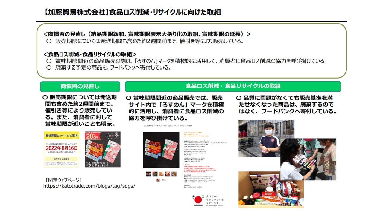 農林水産省による「商慣習の見直しを含めた食品ロス削減や食品リサイクルの取組事例」として、加藤貿易の消費者への食品ロス削減の協力呼び掛け取組が紹介されました