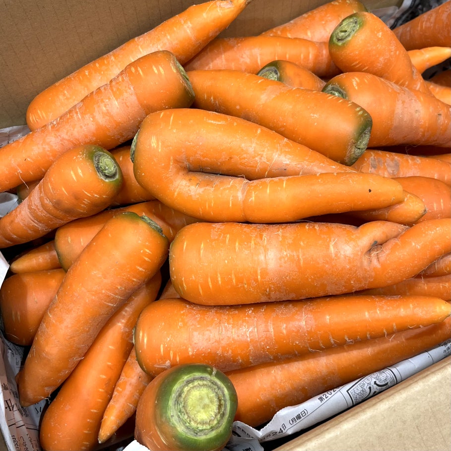 生地は米粉と大豆粉をミックスし、しっとりとした食感に仕上げました。また、味や品質に問題はないにもかかわらず、見た目が変形が理由で破棄されてしまう予定だった福岡県産の規格外の無農薬にんじん(写真参照)を使用しました。にんじんを皮ごと使用することで、美味しくアップサイクルした商品です。にんじんだけでなく、スナックミーでも人気の「プレミアムドライパイン」や「プルーン」も使用することでリッチに仕上げました。また、シナモンとカルダモンをほんのり効かせ、アクセントを加えています。