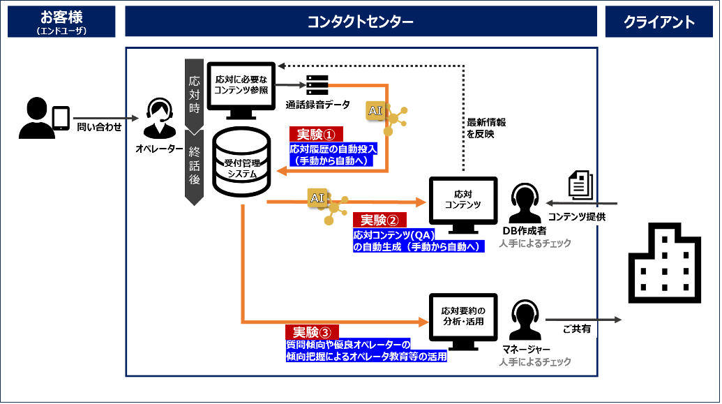 コンタクトセンターにおいては、急速なデジタル化の進展により、これまでの音声による応対に加えてWebやチャットといった複数の顧客応対チャネルを有することが標準化する一方で、応対品質のばらつきやオペレーターが参照するQA、案内スクリプトなどの応対コンテンツの管理に要する稼働の増加が課題となっています。これらの課題を解決し、顧客満足度を高めるために、これまでのコンタクトセンター業務に、生成系AI(ChatGPT)技術の組み込みの有効性を期待しています。